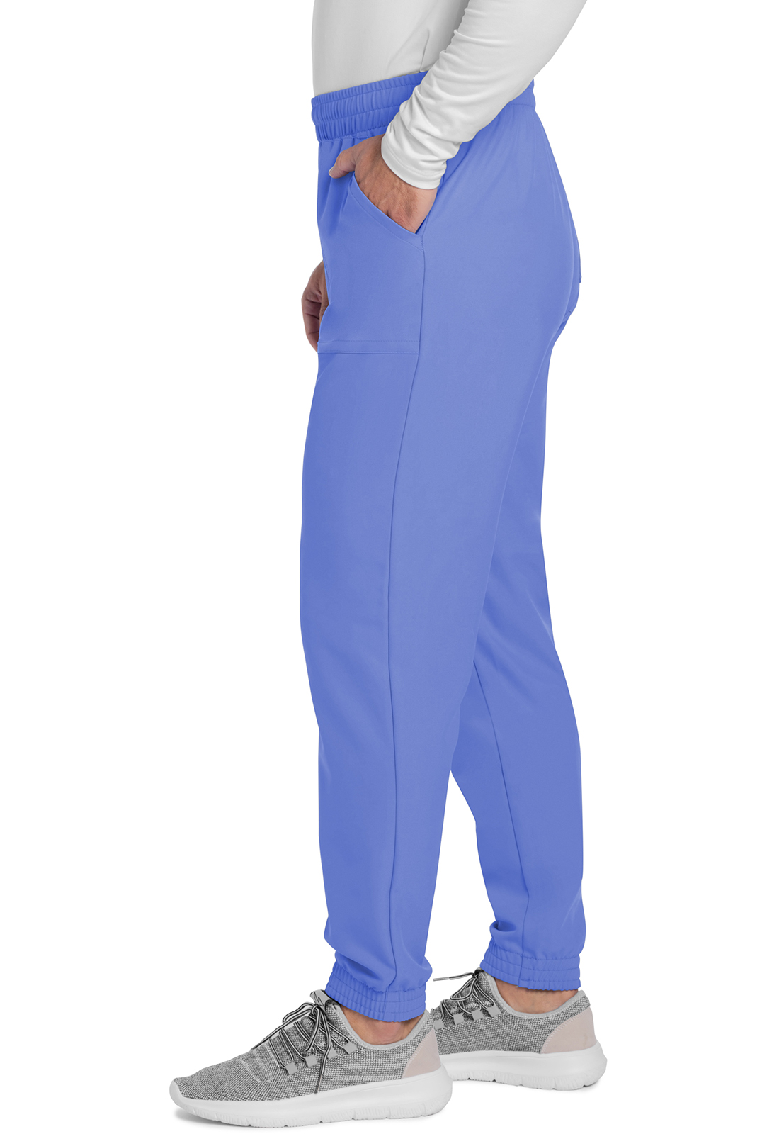 This Men’s fit jogger offers style and function. The mid rise pull-on elasticized waistband has an interior drawstring for adjustability. There are a total of four pockets: two front pockets with slanted entry, one cargo pocket with pen/instrument slot on the wearer’s right side, and one back patch pocket. The cargo pocket and back pocket have reverse hem trim for added detailing. This Men’s scrub jogger is finished with elasticized cuffs and decorative tonal topstitching. Tapered jogger leg, 11 1/2″ opening. Inseam: 30 1/2″
