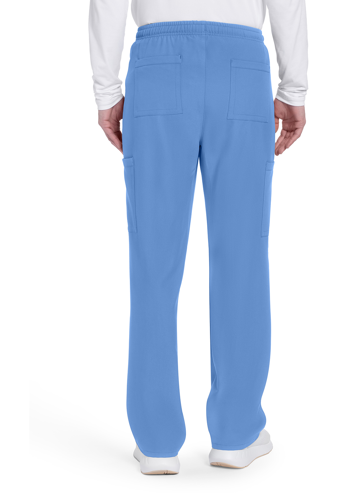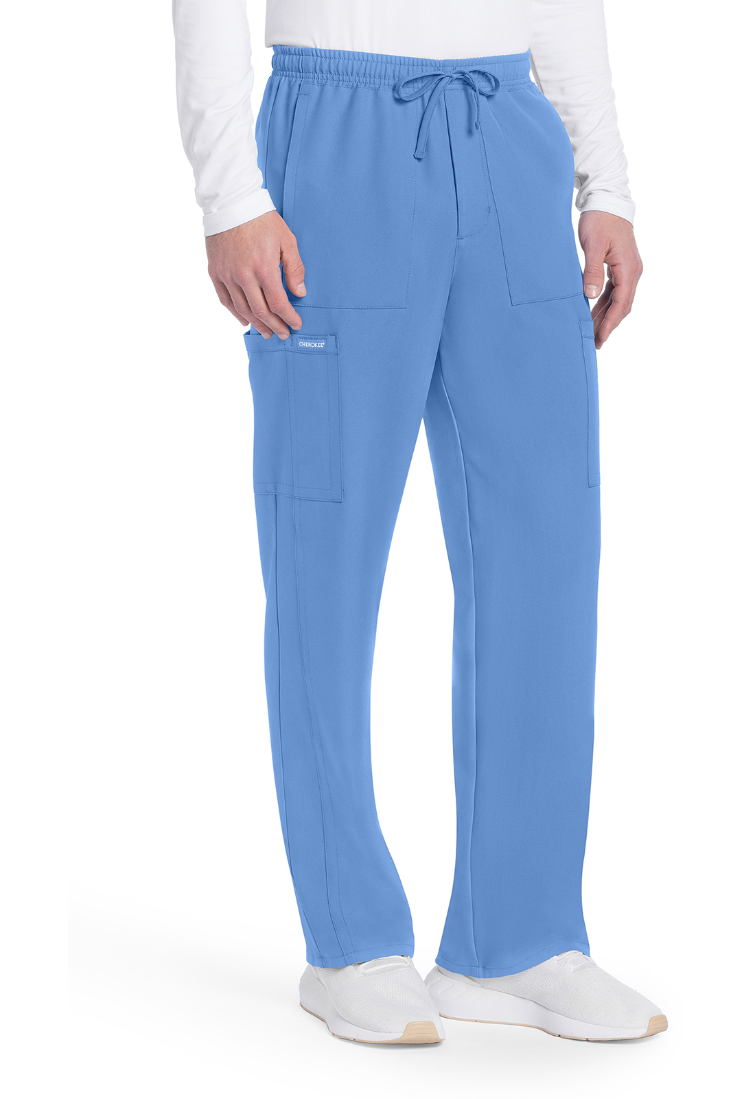 A true Men’s fit pant with zipper fly, this style offers lots of pockets and functional styling. The mid rise elastic-reinforced waistband includes a drawstring for adjustability. There are six pockets for organized storage: two side entry patch pockets, two cargo pockets with pen/instrument slots, and two back patch pockets. The cargo pockets and back pockets have reverse hem trim for added detailing. Forward leg seams provide leg-lengthening style. Decorative tonal topstitching finishes this style. Straight leg, 19″ opening. Inseam: 29 1/2″
