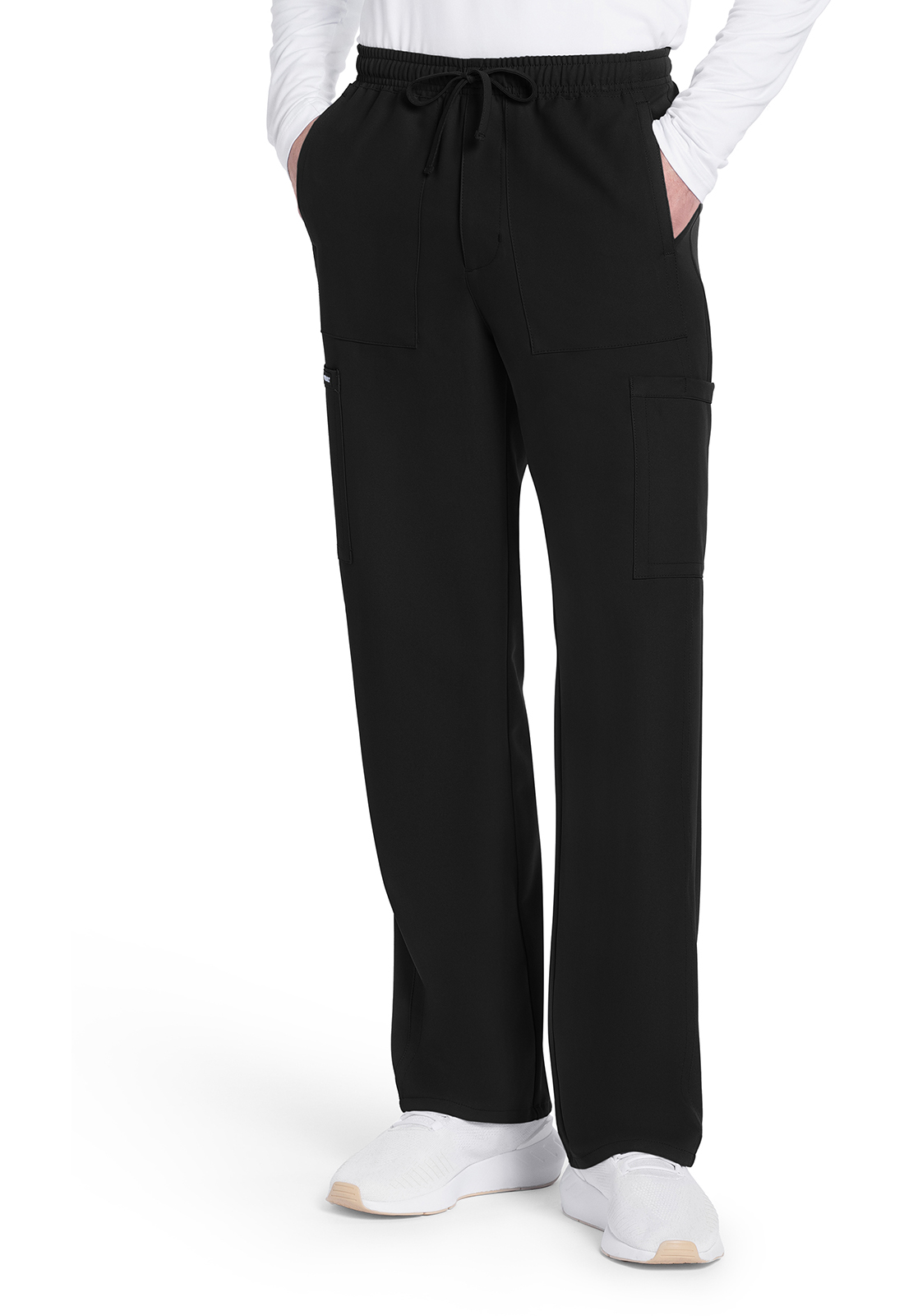 A true Men’s fit pant with zipper fly, this style offers lots of pockets and functional styling. The mid rise elastic-reinforced waistband includes a drawstring for adjustability. There are six pockets for organized storage: two side entry patch pockets, two cargo pockets with pen/instrument slots, and two back patch pockets. The cargo pockets and back pockets have reverse hem trim for added detailing. Forward leg seams provide leg-lengthening style. Decorative tonal topstitching finishes this style. Straight leg, 19″ opening. Inseam: 32″