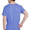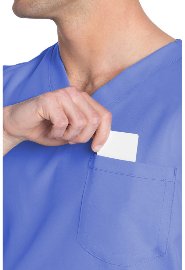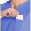 This Unisex fit v-neck top offers genderless classic styling. Chest patch pocket with reverse hem trim. Decorative tonal topstitching. Center back length: 28″
