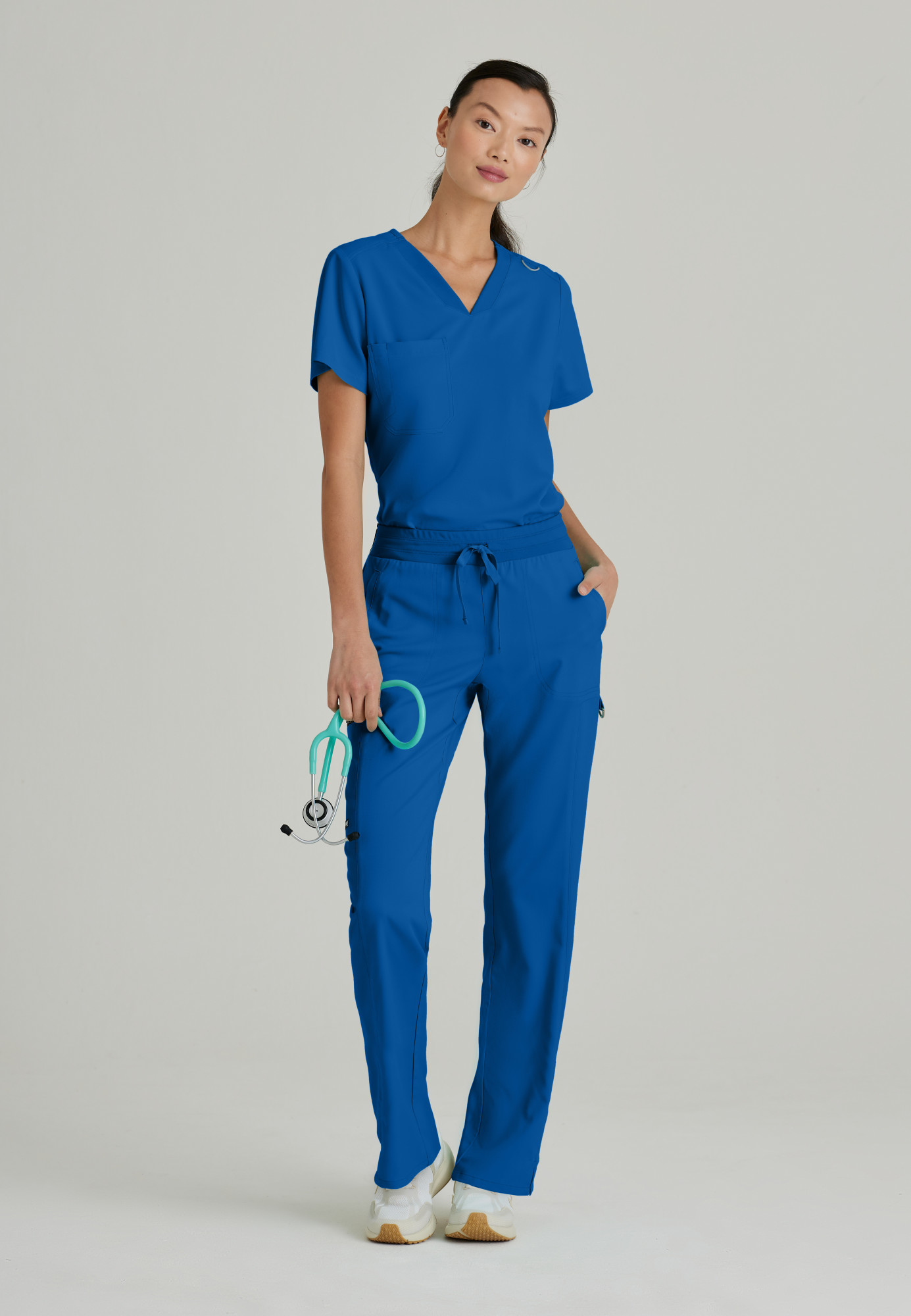 To tuck or not to tuck? This Grey’s Anatomy™ Spandex Stretch Women’s Bree V-Neck scrub top gives you a choice. It’s made of spandex-stretch fabric with a soft cotton touch to keep you comfortable as you move through your demanding shift. Tuck it in for a tailored look or leave it untucked with modern fit and hi-low hemline for added coverage. Additional features include a chest pocket and badge loop.